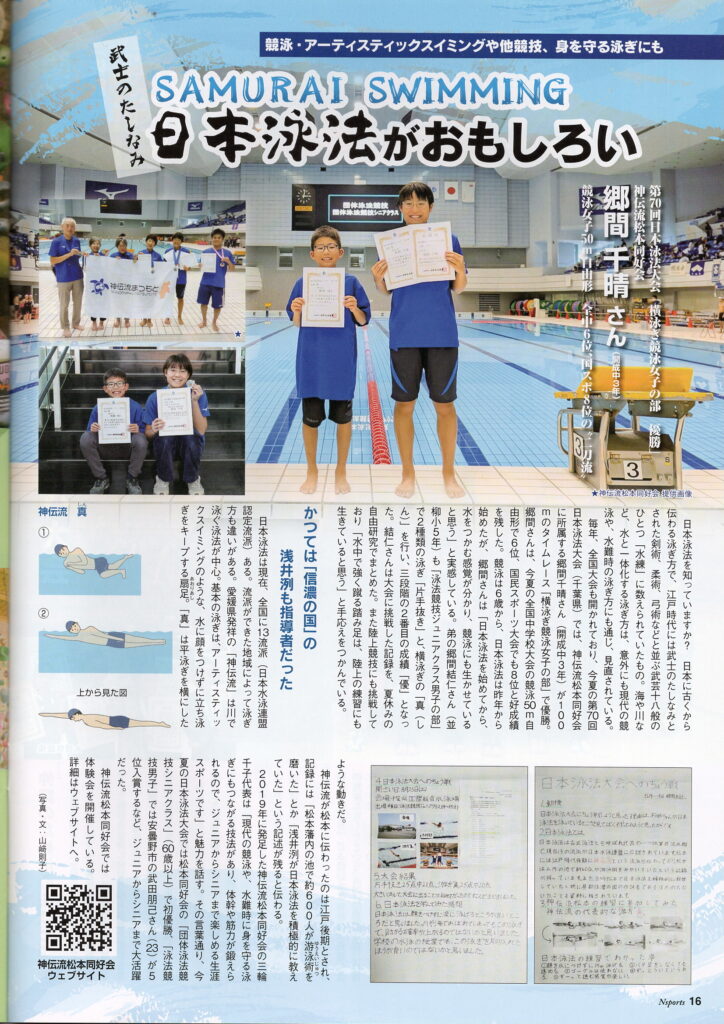 Nsports 2025年12月号に『日本泳法』が紹介されました! 2026年1月5日 最終更新日時 : 2026年1月5日 @chiko Nsports 2025年12月号に『日本泳法』が紹介されました! 『武士のたしなみ SAMURAI SWIMMING 日本泳法がおもしろい』(Nsports 2025年12月号 Vol.35 発行(株)杏花印刷) FacebookXBlueskyHatenaCopy