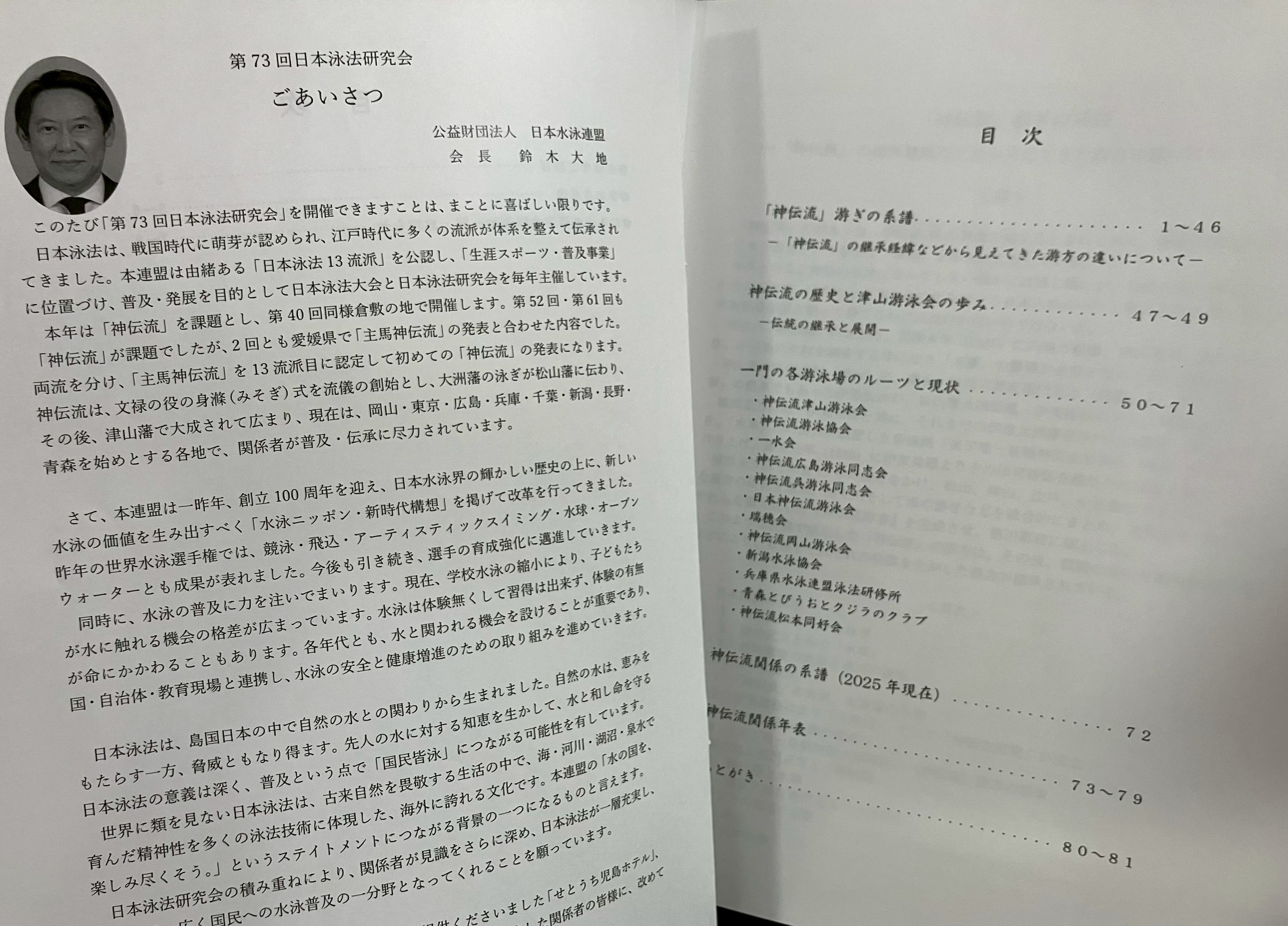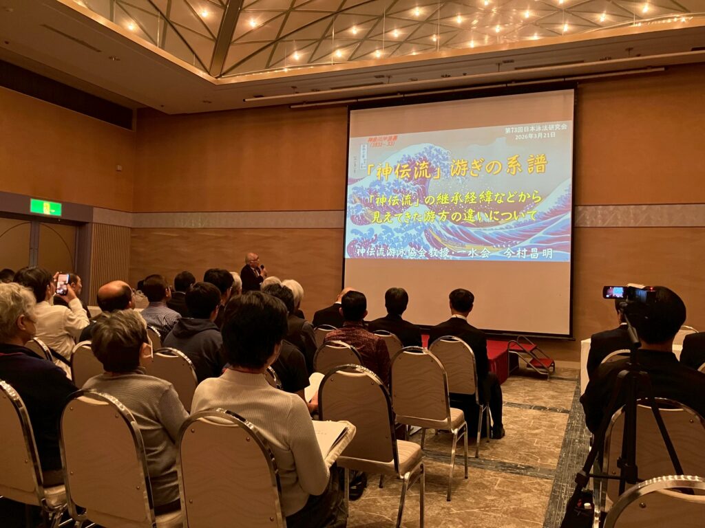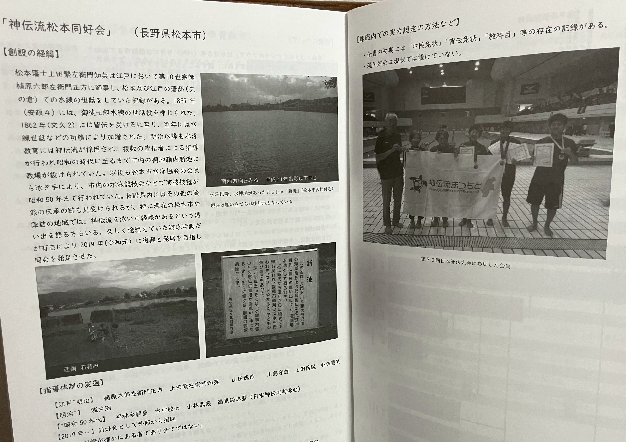 研究発表では、昨年度までの松本同好会の勉強会で明らかになった歴史が追記され、松本が江戸時代から神伝流を泳いでいたことが発表されました。